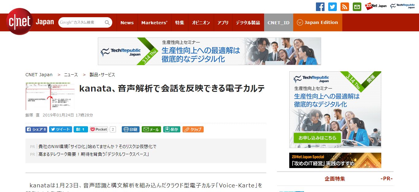 2019年1月23日に『Voice-Karte』のプレスリリース後、なんとなんとCNET Japanさんに記事を掲載していただけました!